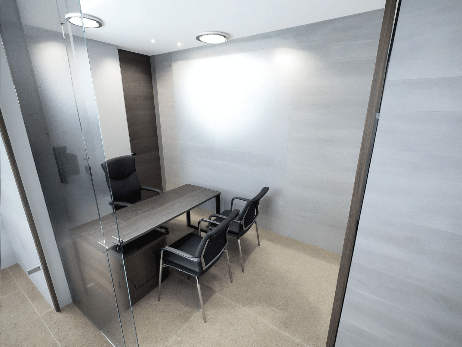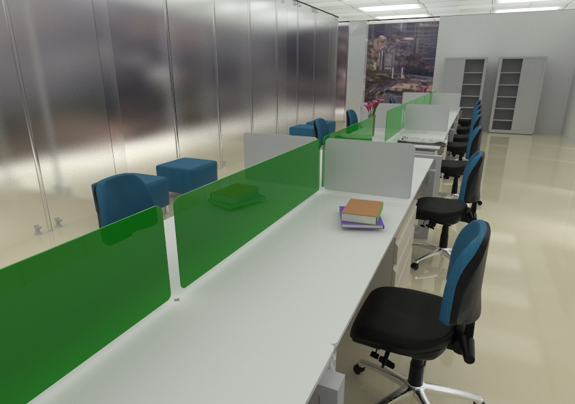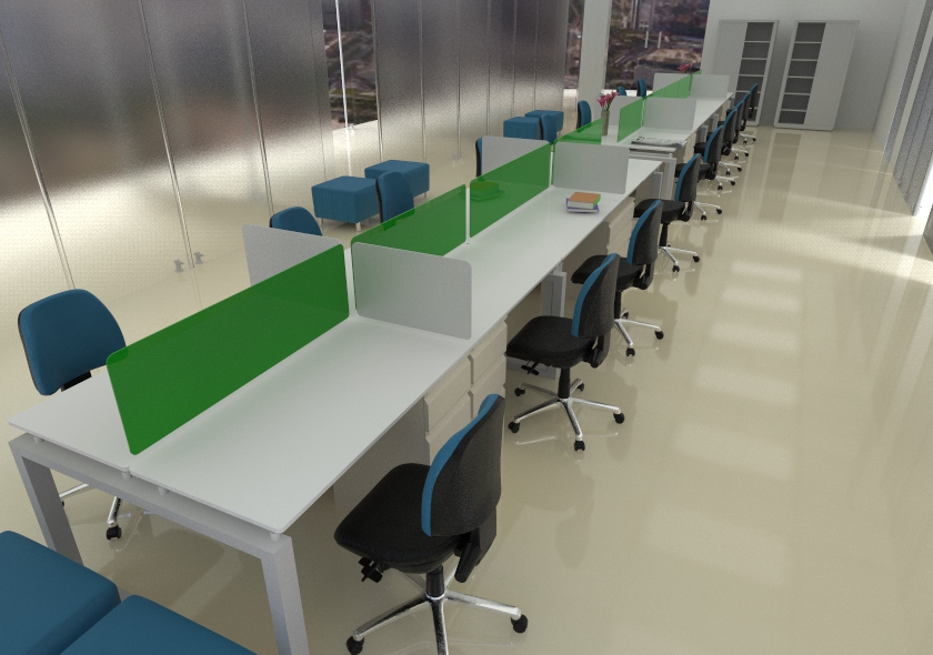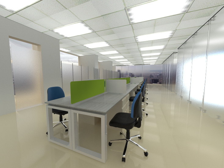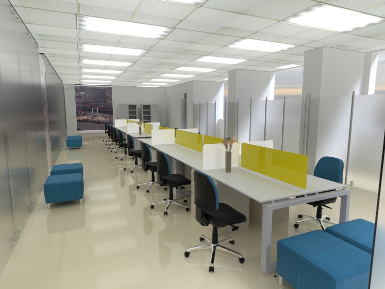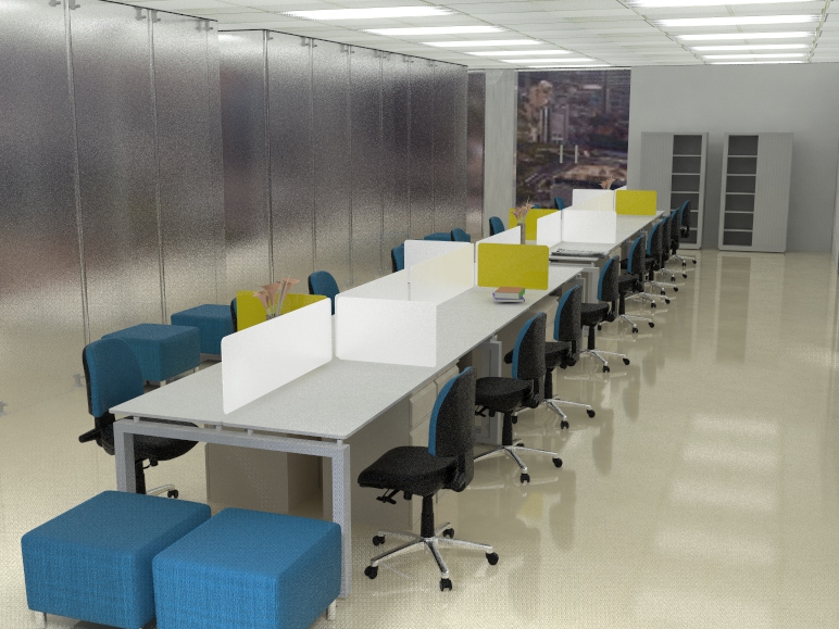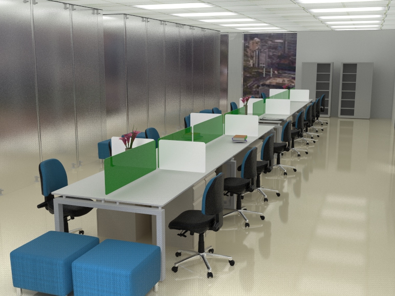 Distribución de espacio y aprovechamiento de los ambientes. Uso de modelos de escritorios acabados de materiales de escritorios en isla y sillas diseñadas y distribuidas por Metálicas Cruz.